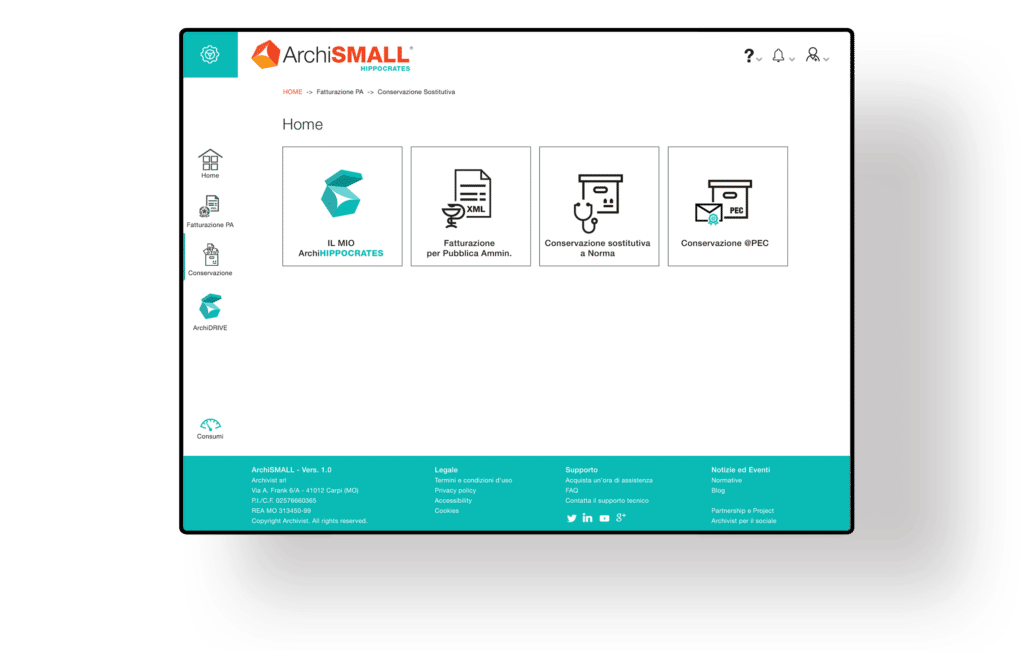ArchiSMALL è la soluzione unica per la gestione del ciclo di Fatturazione Elettronica attiva e passiva e Conservazione Digitale automatica. Grazie all’interfaccia intuitiva, processi lunghi e complessi, diventano facili e veloci. Per tutti, anche per i meno esperti: nulla da installare e nulla da imparare!