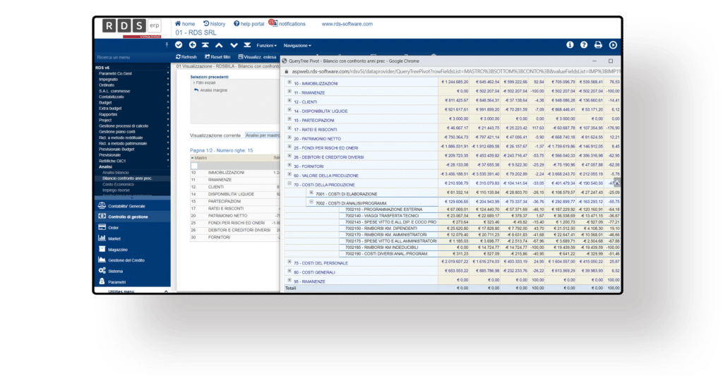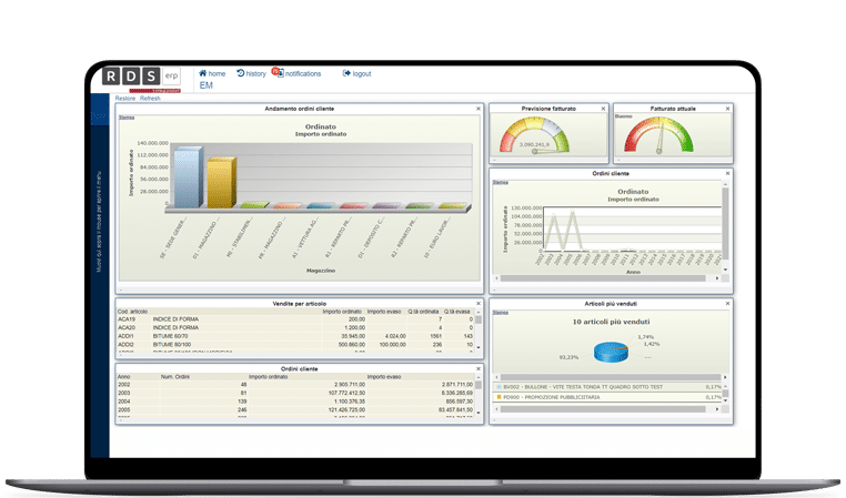 RDS ERP è in grado di trasformarsi in un’efficace applicazione di CPM (Corporate Performance Management) grazie all’integrazione di dati logistici e contabili, alla BI, alle funzioni di Reporting evoluto nonché alle Operational Dashboard.