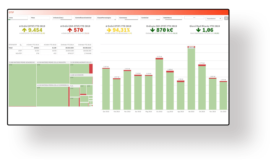 • Analisi OTIF: permette la valutazione del livello di servizio di acquisto per ogni fornitore e per ogni categoria di prodotto.