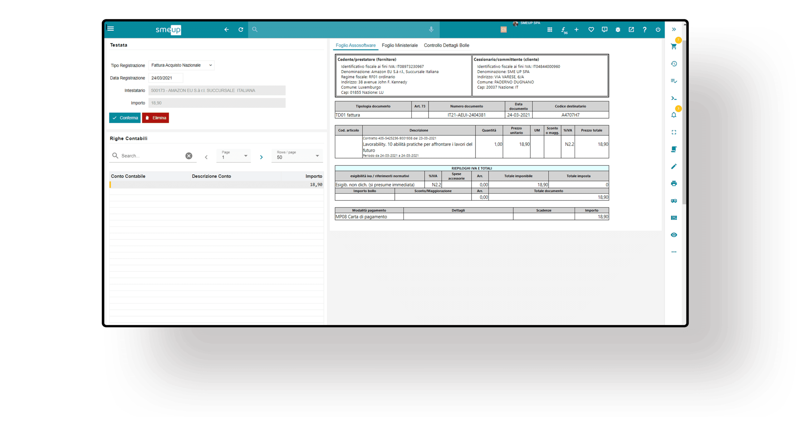 Il Sistema di Interscambio invierà i file del ciclo passivo all’intermediario. L’intermediario si preoccuperà di effettuare un controllo formale del file ed inviare i file al software gestionale. Tramite un cruscotto online l’azienda potrà facilmente consultare le fatture ricevute e, grazie al connettore smeup, il gestionale si preoccuperà di agevolare la registrazione contabile del documento ed inviare i dati della registrazione all’intermediario per la conservazione elettronica del documento stesso.