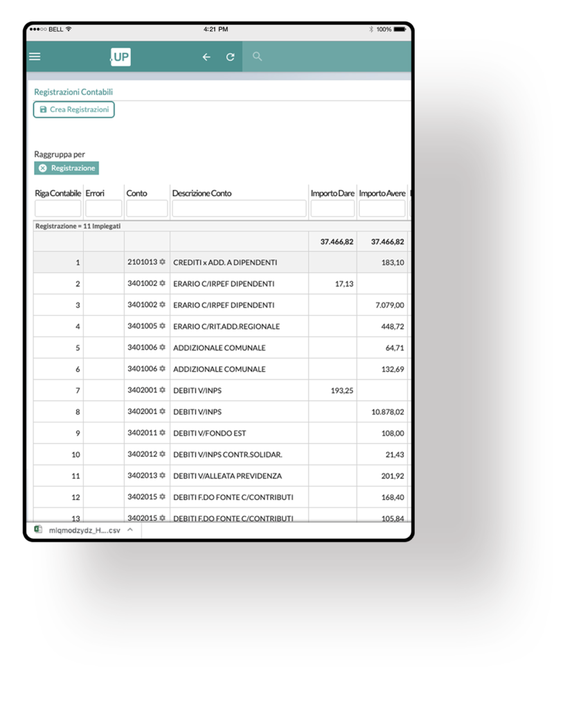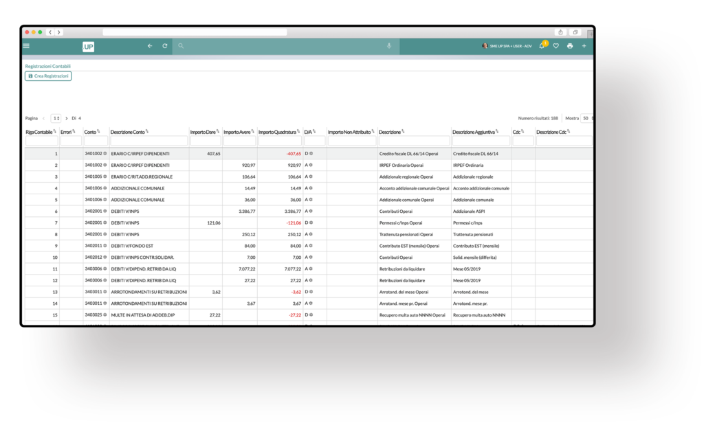 payroll note up ti permette di generare le scritture contabili della cosiddetta “prima nota di paghe e stipendi”, della Prima Nota dei ratei per oneri differiti e della quota TFR maturata nel mese. Le scritture hanno una valenza sia civilistica che gestionale (per centro di costo).